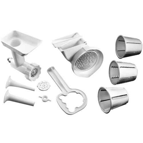 Kit Set Gourmet Specialty KIO01 da KitchenAid. Este kit combina várias funções: enchedor de linguiça, moedor de alimentos, fatiador e ralador. Este acessório é opcional e exclusivo das Batedeiras KitchenAid. Deve ser acoplado à base de uma das Batedeiras, seja ela 110V ou 220V. A base da batedeira não acompanha este produto.